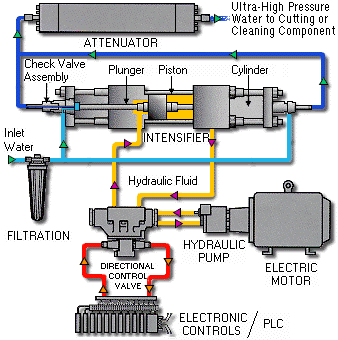 闈炲父楂樺帇姘村垏鍓茬殑鏍稿績鏄埄鐢ㄩ珮閫熸按娴佸拰姘村垁鐮傛贩鍚堟祦鏉ュ鐗╄川杩涜鍒囧壊锛屽洜姝ゅ叧閿湪浜庢按鐨勫姞閫熴傛按鍒涓昏鐢遍珮鍘嬫车銆佹暟鎺у姞宸ュ钩鍙板拰鍠峰皠鍒囧壊澶寸粍鎴愶紝鍏朵腑楂樺帇娉垫槸瀵规按娴佽繘琛屽姞鍘嬬殑涓昏閮ㄥ垎銆傛櫘閫氭按閫氳繃楂樺帇娉靛姞鍘嬪悗锛屽彲浠ュ皢姘村帇鍔涙彁鍗囪嚦4,000bar锛60,000psi锛夛紝鐒跺悗閫氳繃缁嗗皬鐨勫柗鍢磋繘琛屽柗灏勩傚湪鍔犳矙姘村垏鍓蹭腑锛屾按鍜屾按鍒鐮傛贩鍚堝悗锛屼篃鍙互鑾峰緱楂橀熷害銆傜粡杩囨按鍒鐮傜鍚庯紝姘村拰鐮傜殑娣峰悎鐗╂祦閫熷彲浠ヨ揪鍒版瘡绉915绫筹紝鐩稿綋浜庨煶閫熺殑涓夊嶃
